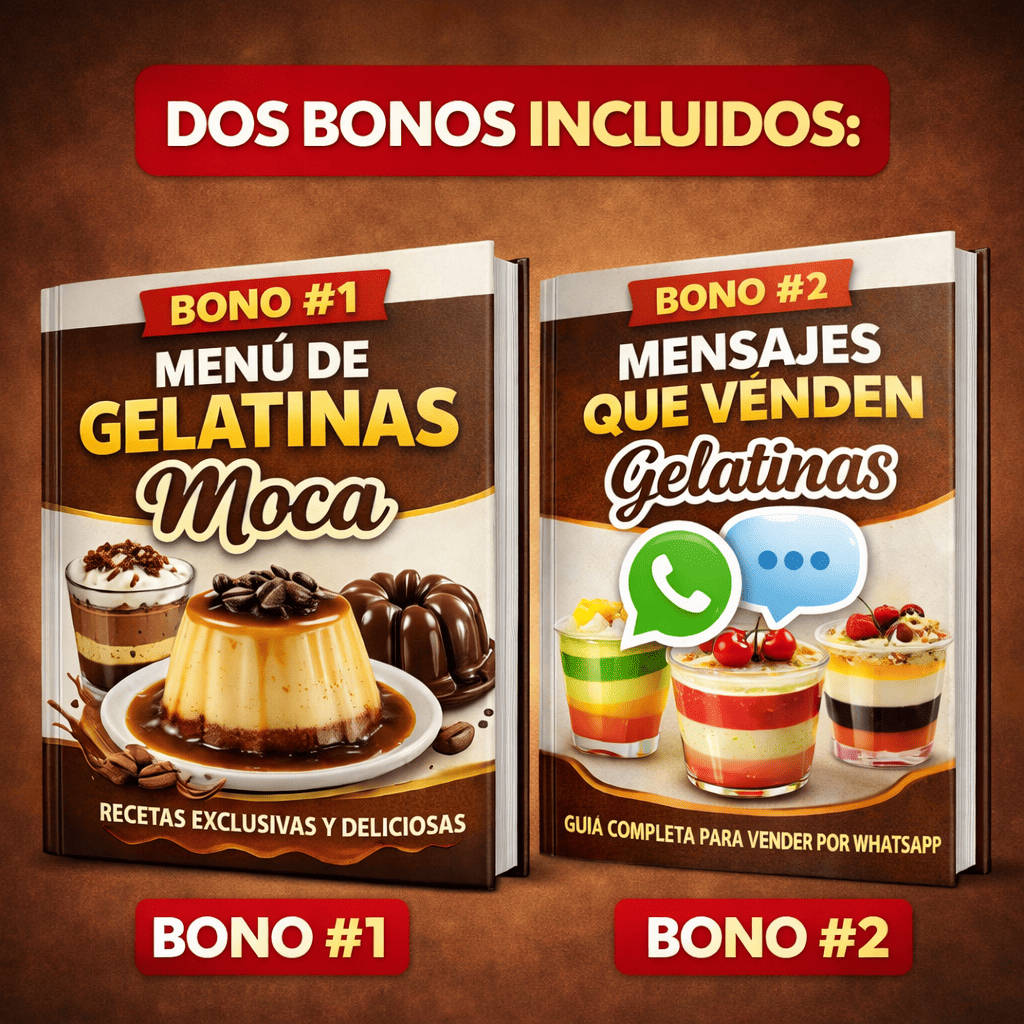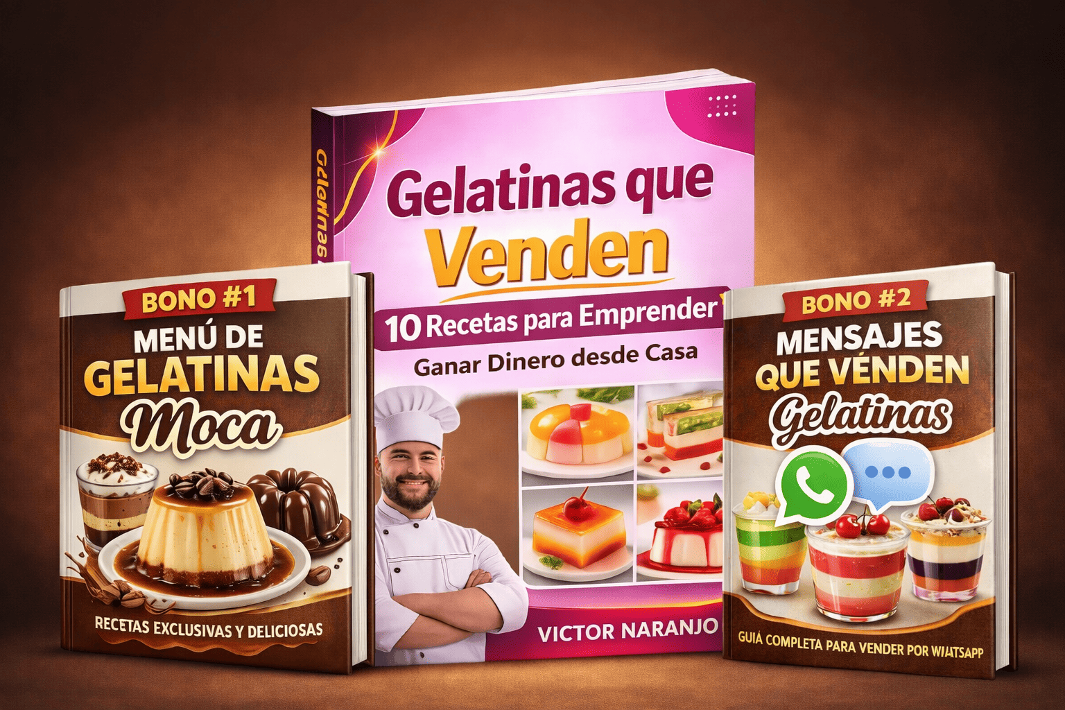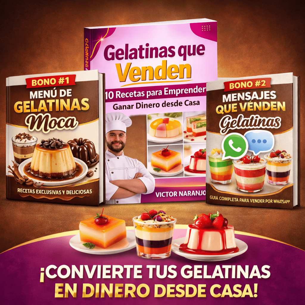 A través de un recetario práctico con 10 gelatinas paso a paso, acompañado de bonos exclusivos donde aprenderás a vender, calcular precios, conseguir clientes y usar mensajes listos para ofrecer tus productos.